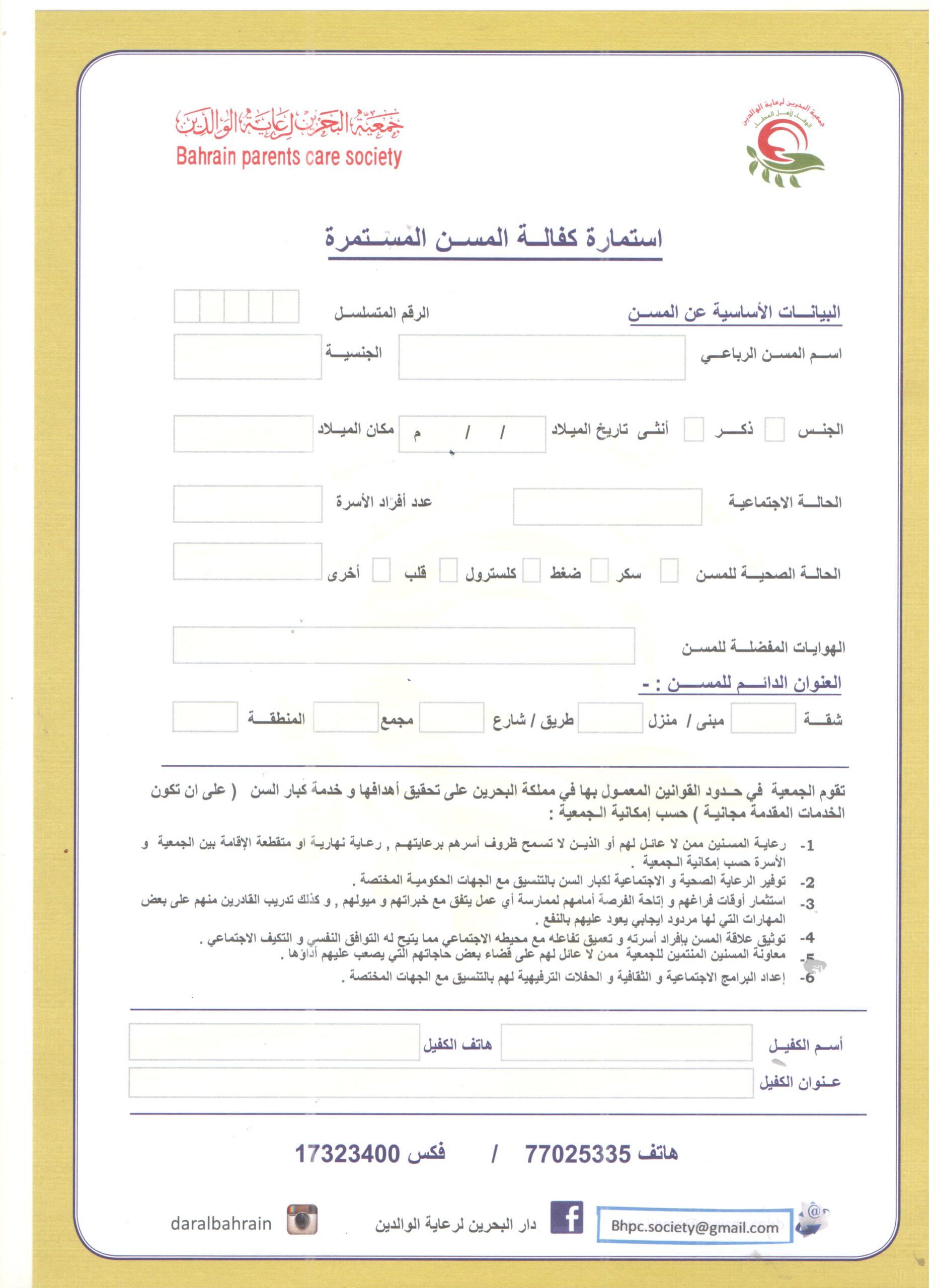كفالة المسن مشروع هو الأول من نوعه في البحرين أطلقته جمعية البحرين لرعاية الوالدين، وتسعى الجمعية من خلال مشروع كفالة المسن لتلبية احتياجات المسنين المختلفة لإعانتهم على الحصول على رعاية دائمة ومستمرة تسمح لهم بالحفاظ على العيش الكريم