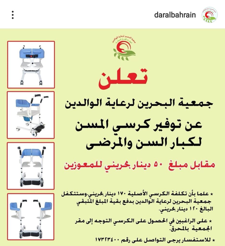 كرسي المسن من المشاريع الرائدة و المتميزة في مملكة البحرين اطلقته جمعية البحرين لرعاية الوالدين و الذي يعد اول مشروع تطلقه جمعية مختصه برعاية كبار السن والذي يعد من المشاريع الريادية من اجل خدمة المسن وراحته واندماجه في المجتمع ، ممايعمل على قضاء الضروريات ومتطلبات الحياة اليومية .